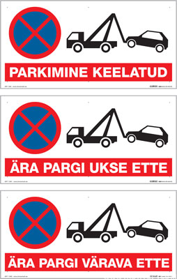 Parkimise keeld ja teisaldamise hoiatus (PARKIMINE KEELATUD). Parkimise märgid kliendi tekstiga. 200x300, 300x450mm või suurem.