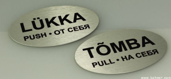 LÜKKA-TÕMBA kolmekeelne (est + rus + eng) hõbedane kleebitav metallist uksesilt komplektis 2tk