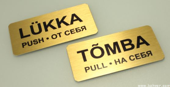 LÜKKA-TÕMBA kolmekeelne (est + rus + eng) kuldne kleebitav metallist uksesilt (2tk) 60x30mm.