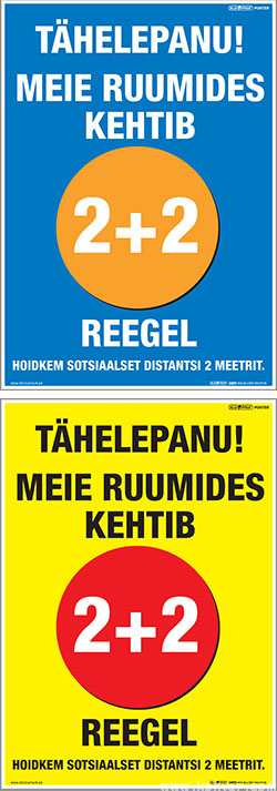Tähelepanu! Meie ruumides kehtib 2+2 reegel. Poster teavitamaks sotsiaalse distantsi vajadusest.