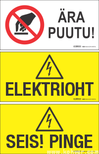 Pehme magnetsilt "ÄRA PUUTU!", "SEIS.PINGE" või "ELEKTRIOHT" (eestikeelne). Ühepoolne. Võimalik ka riputussilt.