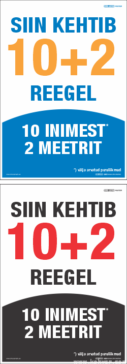 Siin kehtib 10+2 reegel. 10 inimest 2 meetrit. Poster teavitamaks sotsiaalse distantsi vajadusest.