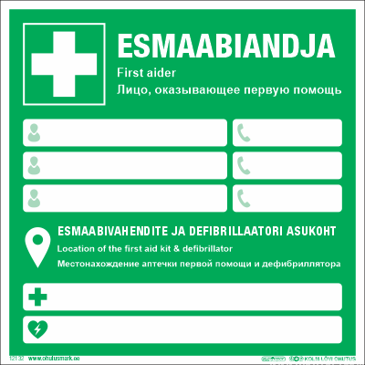 Esmaabiandja nimed ja esmaabivahendite ning defibrillaatori asukoht (kolmekeelne EST+ENG+RUS). 20x20cm