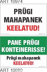 10974 Prügi mahapanek keelatud!. 10980 Pane prügi konteinerisse. Prügi mahapanek keelatud. Telli oma tekstiga. MALL:0.75.