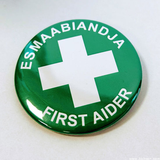 Rinnamärk "ESMAABIANDJA / FIRST AIDER" 64mm, haaknõelkinnitus või magnetkinnitus
