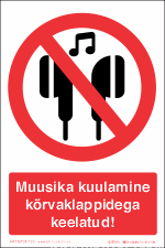"Muusika kuulamine kõrvaklappidega keelatud!" tekstiga ohutusmärk.
