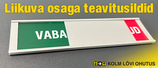 Liikuva osaga teavitussilt (fotol kaks asendit vaba / hõivatud) näiteks koosoleku ruumi ukse kõrvale seinale kleebitav 170x45mm.
